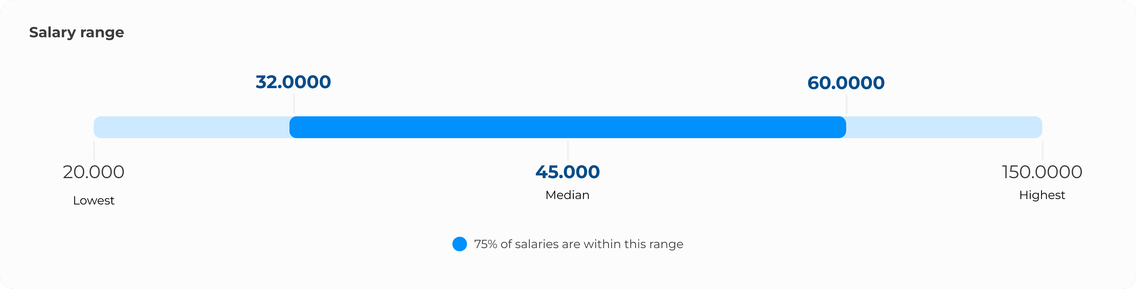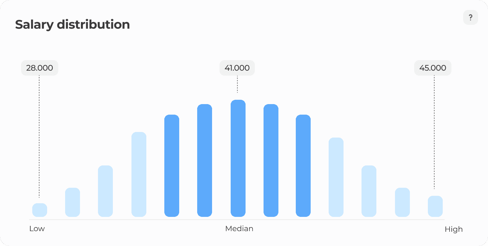 While I considered adding informative labels to the bell curve, I changed it completely. Instead, I created one simple bar that would show distribution, highlighting the 75% range, median, and lowest + highest salaries, giving the users all the information they were looking for, making the assisting cards obsolete.