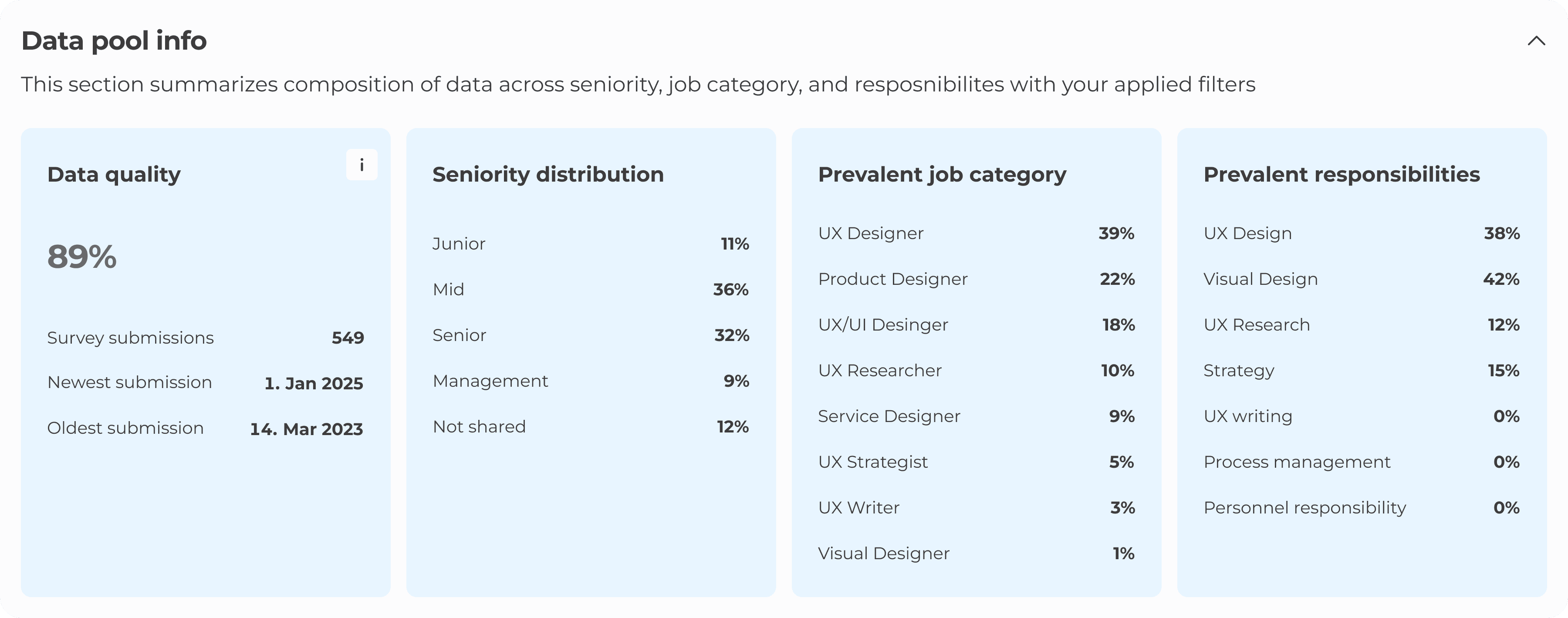 The multi-select functionality created a new challenge – how do we make sure designers understand the results of combined categories? I created a data pool section giving designers insight into the composition of the filtered data. I decided to add responsibility data here, not completely sure how to shape it.